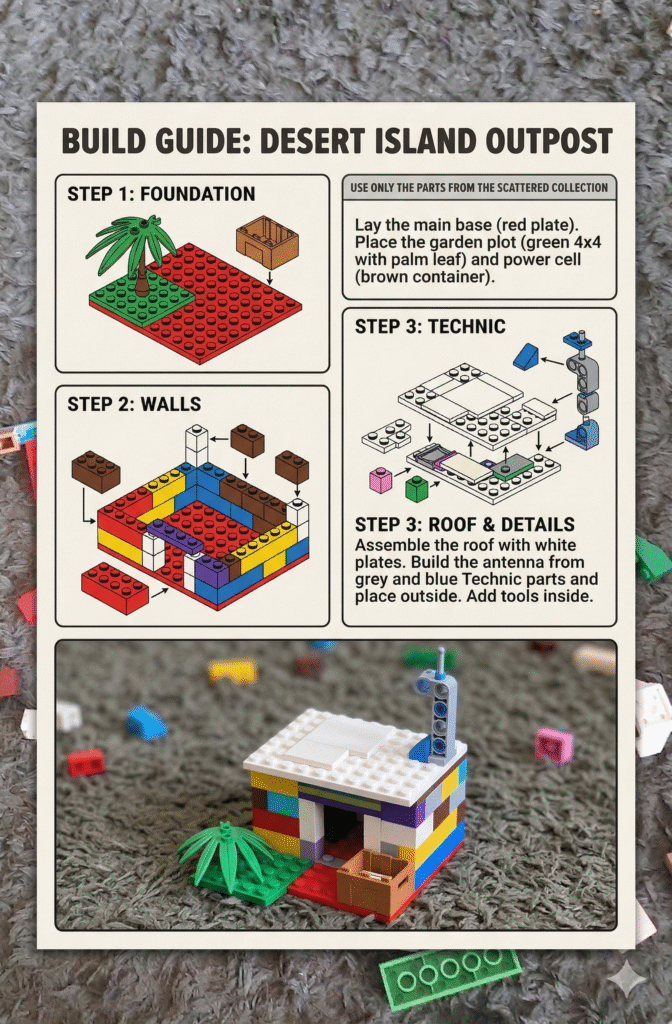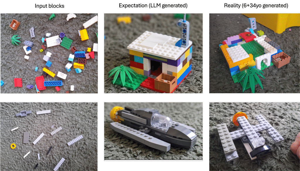 We had a few days off, so we were playing with Legos. At some point, my 6-year-old son suggested, “Can we ask this robot (LLM) to build something with Legos?” I said, “Sure, but you do the building.” He started to scatter random Lego pieces on the floor, I took a photo, and Gemini’s task was to come up with a design for a new Lego creation using the pieces in the photo.