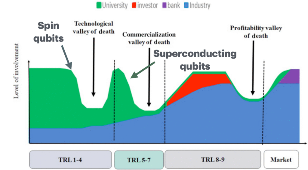 A few years behind are spin qubits, which are preparing to leapfrog the first gap (Lab-to-Prototype). While still in the university-funded phase, we now face the challenge of building a system that in principle can be scaled up. This requires to move from “hero-device” mentality and to start thinking about reliability, modularity, and manufacturability. This demands a systems engineering mindset and model-based design, but still requires enough academic flexibility to iterate and discover new phenomena. Only once the proof-of-concept is achieved, we can think further about stakeholder needs and a clear value proposition.